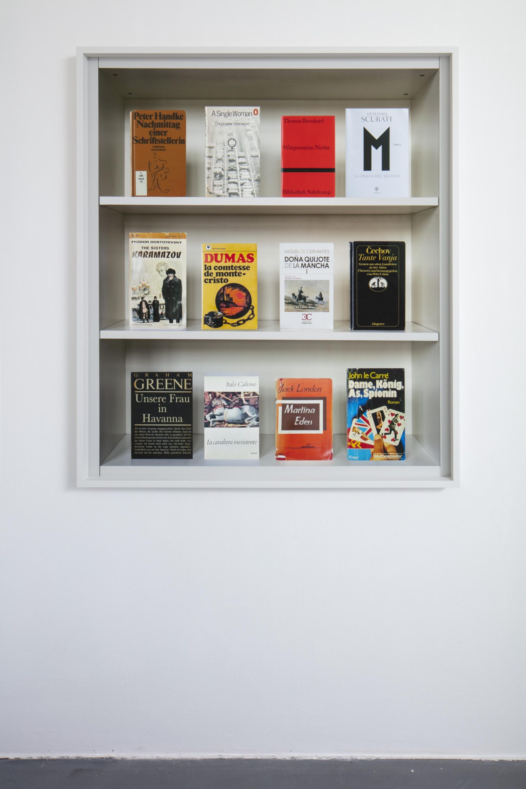 In this way, Musil’s Der Mann ohne Eigenschaften becomes Die Frau ohne Eigenschaften. The over 300 digitally placed books on the shelves are part of the ongoing series New Publications edited by Daniela Comani (2007 and ongoing), in which all titles have been altered by the artist.